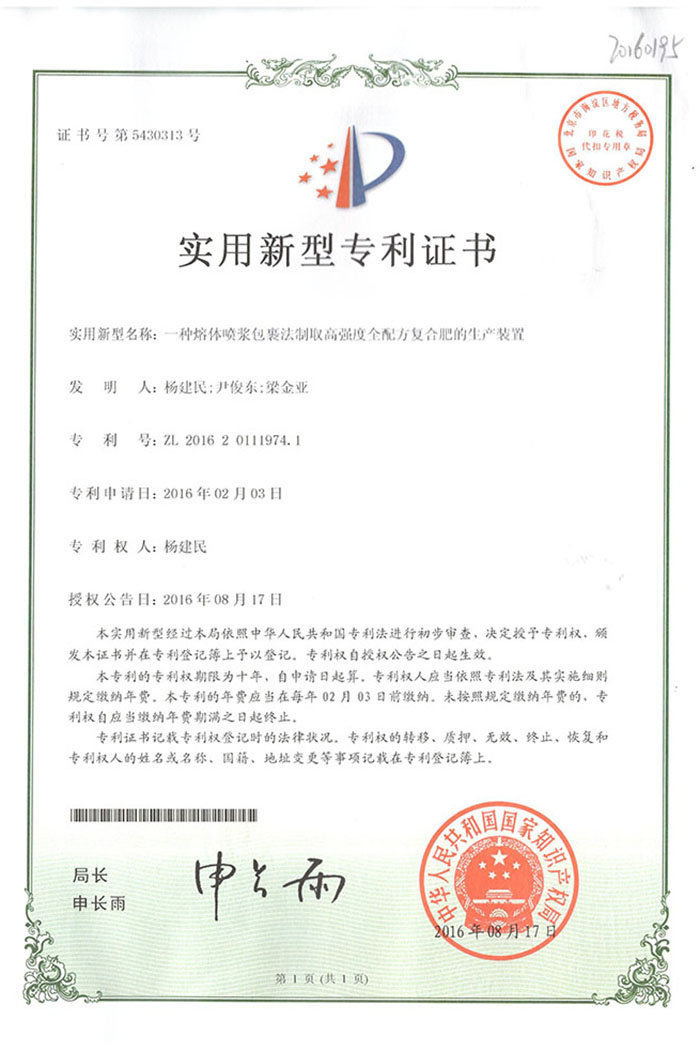 熱烈祝賀我公司又取得一項專利《一種熔體噴漿包裹法制取高強度全配方復合肥的生產(chǎn)裝置》